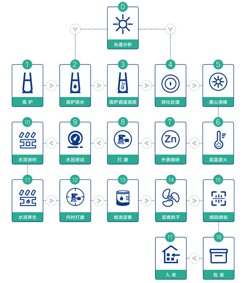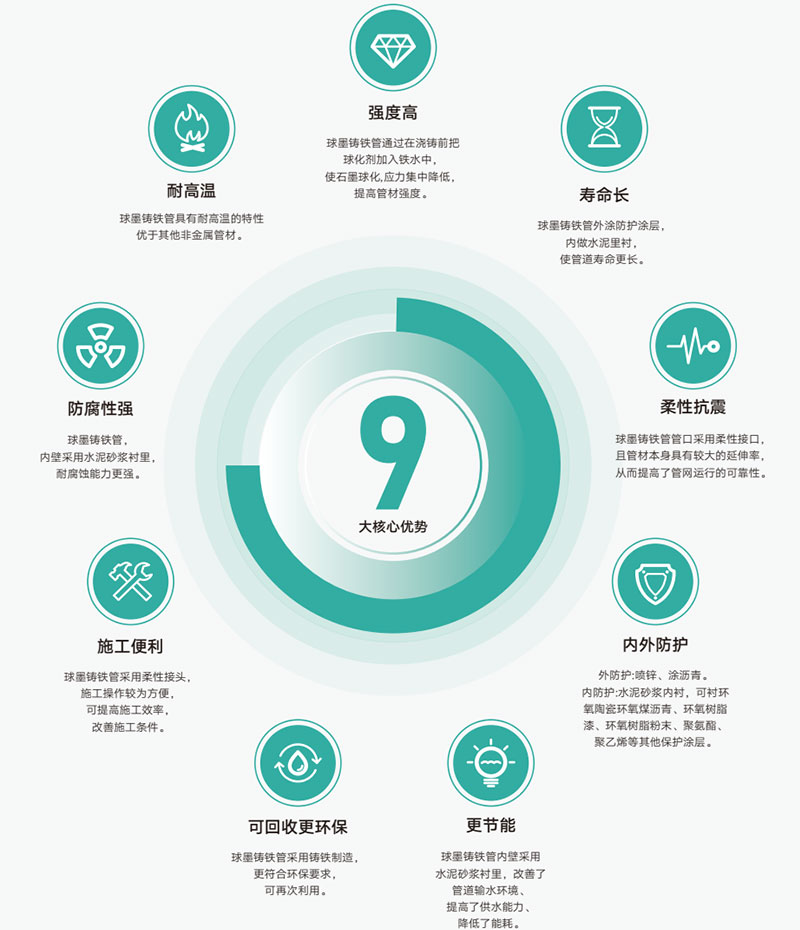 球墨鑄鐵管是指鐵水經(jīng)添加球化劑后,經(jīng)過(guò)離心球墨鑄鐵機(jī)高速離心鑄造成的管材。球墨鑄鐵管中石墨是以球狀形態(tài)存在的,克服了片狀石墨對(duì)鐵基體連續(xù)性的阻止作用,使鐵具有了卓越的可延性、柔韌性和抗沖擊性,因而材料本身的機(jī)械性能得到了較好改善,具有鐵的本質(zhì)、鋼的性能。